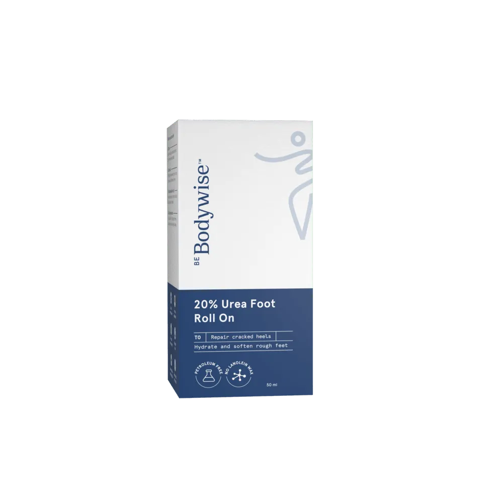Be Bodywise 20% Urea Foot Roll On 50ml is specially formulated to treat dry, rough, and cracked heels. Enriched with 20% Urea, it works as an effective exfoliating and hydrating agent that gently removes dead skin while deeply moisturizing the feet. The easy-to-use roll-on applicator ensures targeted, mess-free application and better absorption. With regular use, it helps restore smoothness, reduce heel cracks, and keep feet soft and healthy-looking. Suitable for very dry and callused skin.