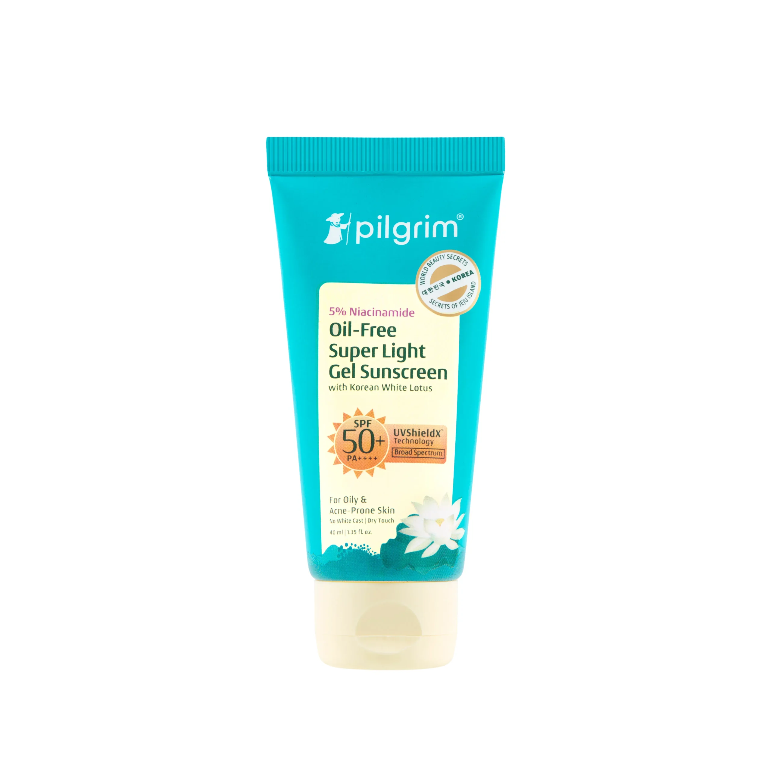 Pilgrim 5% Niacinamide Oil-Free Super Light Gel Sunscreen provides broad-spectrum sun protection with a lightweight, non-greasy finish.
